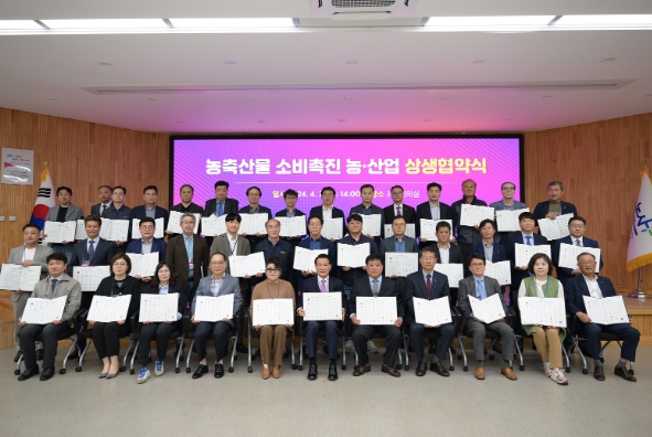지난 24일‘논산시-농업인단체(5)-논산시기업인협의회(28)-위탁급식기업(5)-논산시농업협동조합 운영협의회(3)’, 총 48개의 협약 주체들이 서명한『기업과 농업이 상생하는 농축산물 소비촉진 생생 협약』에는 기업들이 식품제조와 구내식당 운영에 사용되는 쌀, 야채, 축산물, 공산품을 논산시 생산품으로 우선 구매한다는 내용이 담겨 있다.