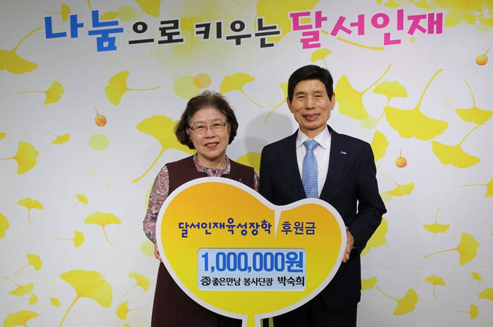 [뉴스서울] 대구 달서구가 27일 박숙희 좋은만남 봉사단장이 지역인재 육성을 위해 써달라며 100만원의 후원금을 달서인재육성장학재단에 전달했다고 밝혔다.