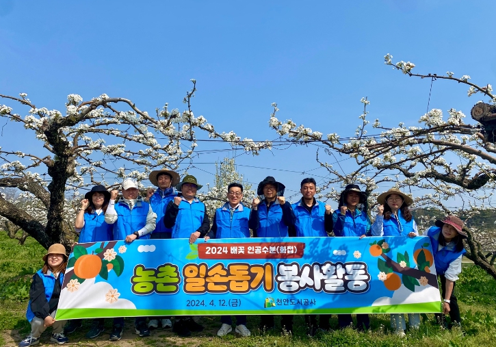 [뉴스서울] 천안도시공사는 본격적인 배꽃 개화기를 맞아 배꽃 인공수분 봉사활동을 실시했다고 16일 밟혔다.