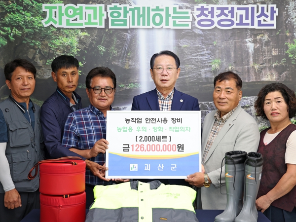 이날 괴산군은 괴산군이장협의회에 농업용 우의, 안전장화, 작업의자 2,000세트, 126,000천원 상당의 농작업 안전사용 장비를 전달했다.