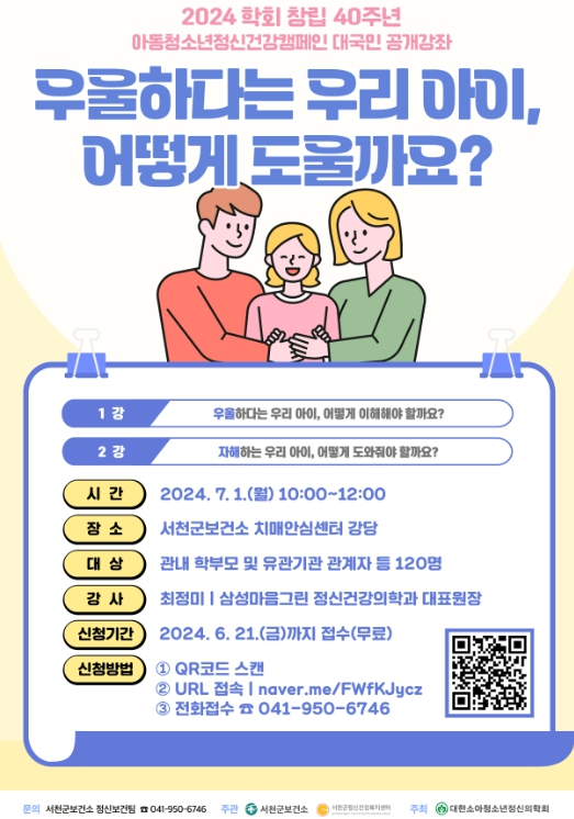 [뉴스서울] 서천군이 7월 1일 서천군보건소 치매안심센터에서 ‘우울한 우리아이 어떻게 도울까요?’라는 주제로 2024년 아동청소년 정신건강 캠페인 대국민 공개강좌를 개최한다.
