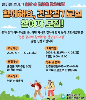 [뉴스서울] 홍천군은 04월25일부터 26일까지 2일간 홍천군 남산에서 걷기 활성화를 위한 『함께해요, 건강 걷기 교실』을 운영한다.