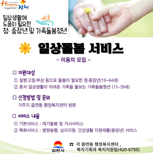 [뉴스서울] 김천시는 돌봄이 필요한 청・중장년과 가족 돌봄 청년의 일상생활의 어려움을 해소하기 위해 오는 4월부터 일상 돌봄 서비스 사업을 시행한다고 밝혔다.