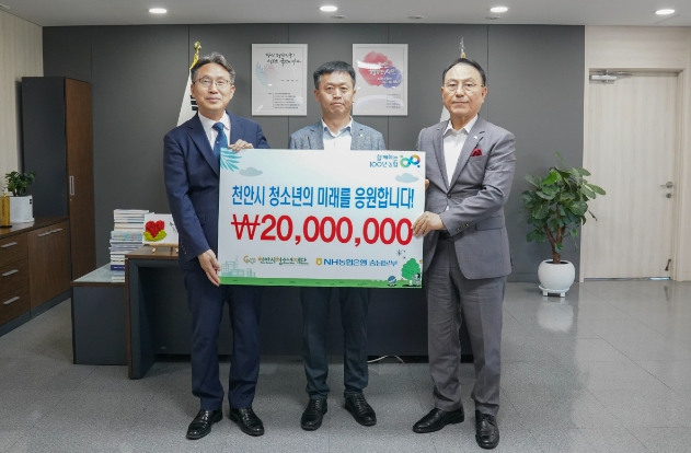 기부금 전달식에는 천안시청소년재단 이사장인 박상돈 천안시장을 비롯해 조승국 농협은행 천안시지부장, 한상경 천안시청소년재단 대표이사 등이 참석했다.