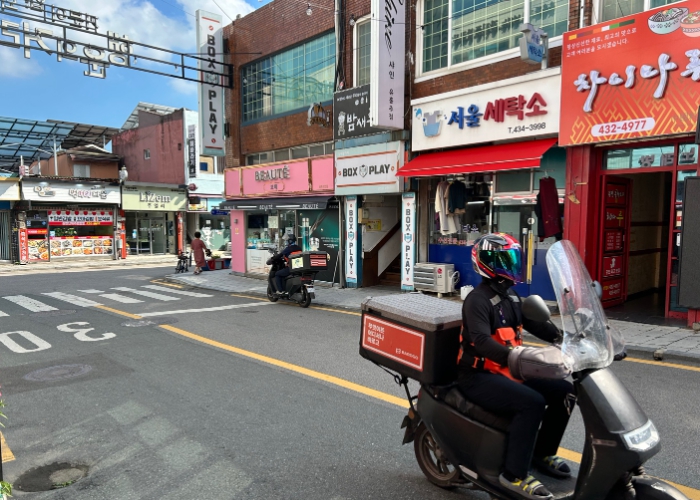 ▲ 먹깨비 주문 배달을 위해 라이더가 강진읍내를 바삐 나서고 있다. |
