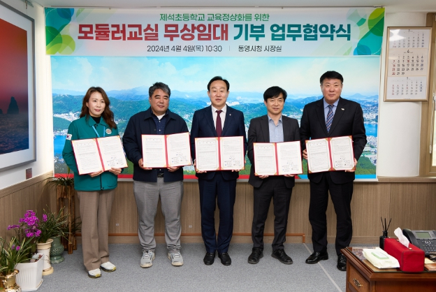 [뉴스서울] 통영시는 4일 시장 집무실에서 통영교육지원청, 제석초, ㈜대승엔지니어링, ㈜엔알비가 함께하는 제석초 교육정상화를 위한 모듈러교실 무상임대 업무 협약식을 개최했다.