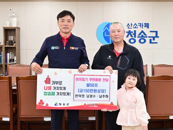 [뉴스서울] 청송군는 지난 4월 8일 안덕면 노래1리 (전)이장 남경수씨가 자녀 주하와 함께 150만원상당 쌀 50포를 청송군에 전달했다고 밝혔다.
