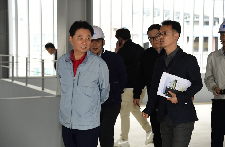 ▲ 최문순 군수가 22일 화천읍 산천어 주차타워 및 가족센터 건립사업 현장을 방문해 진행상황을 점검하고 있다 |