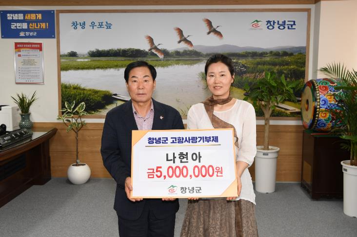 나현아 씨는 “제가 살아왔고 앞으로 살아갈 창녕을 위해 기쁜 마음으로 고향사랑기부금을 내놓게 됐다”라고 기탁 소감을 전했다.