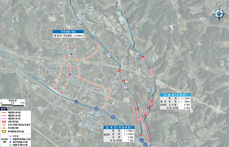시는 2029년까지 총사업비 340억 원(국·도비 221억 원)을 투입해 ▲우수관로 개선 4km ▲금계천 정비 1km 및 교량 4개소 설치 ▲산법천 정비 1.8km 및 소교량 5개소 설치 ▲방재시설로 CCTV, 예경보시설 및 재난알림전광판 각 1개소 설치 등을 추진한다.