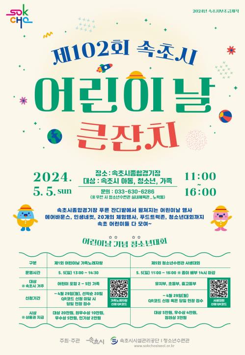[뉴스서울] 속초시는 오는 5일 11시부터 16시까지'제102회 어린이날 기념 큰잔치'를 속초시 종합경기장에서 개최한다.
