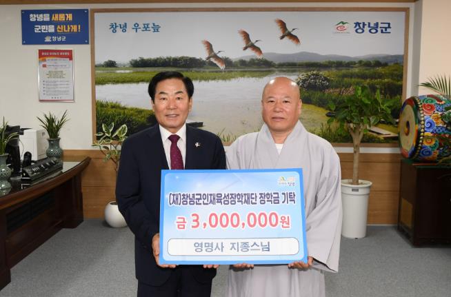 [뉴스서울] 창녕군은 영산면에 있는 영명사에서 지난 20일, 지역의 인재 육성을 위해 써달라며 (재)창녕군인재육성장학재단에 장학금 3백만 원을 기탁했다고 밝혔다.