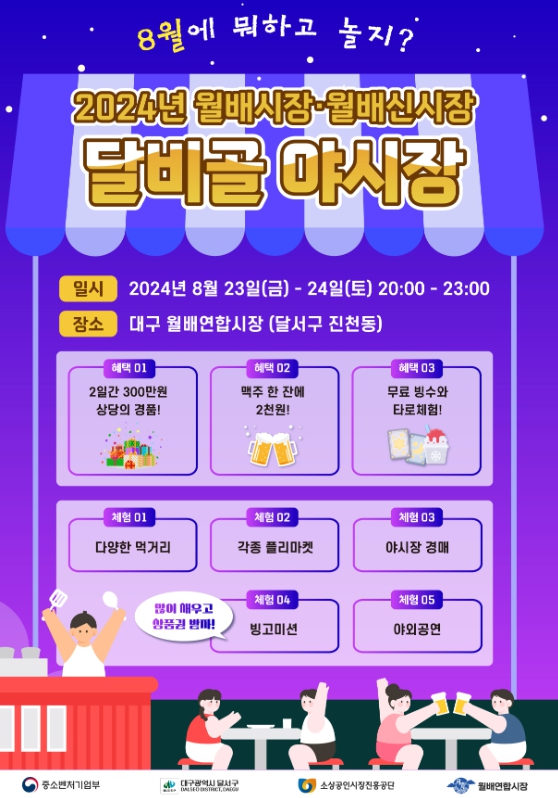 [뉴스서울] 달서구에서 최초로 개최되는 2024 월배·월배신시장 야시장은 23일(금)~24일(토) 오후 8시부터 11시까지 이틀간 진행된다. 행사는 여름밤의 낭만을 더해 줄 버스킹 공연 및 팝업스토어 운영, 체험행사, 빙고미션을 통한 경품이벤트 등 고객들에게 다양한 먹거리, 즐길거리, 볼거리를 제공할 예정이다.