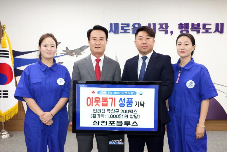[뉴스서울] 삼천포 블루스는 지난 17일 사천시청을 방문해 사천시농업기술센터 유기견 보호소에 전달해 달라며 1000만 원 상당의 반려견 유산균 200박스를 지정·기탁했다.
