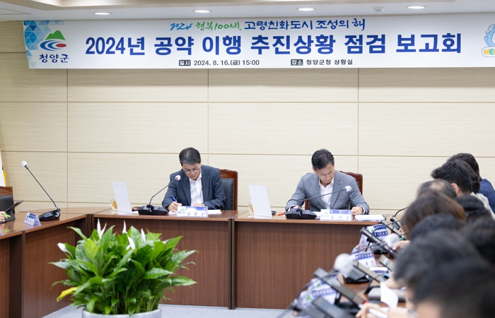 [뉴스서울] 청양군은 지난 16일 군청 상황실에서 민선8기 2024년 공약 이행 추진상황 점검 보고회를 열고 100% 완료 의지를 다졌다.