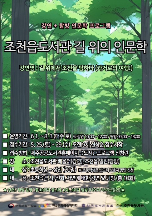 한편‘길 위의 인문학’은 문화체육관광부와 한국문화예술위원회가 국민 일상생활 공간과 가까운 전국 문화기반시설에서 인문학에 담긴 가치와 지혜를 배우고, 삶의 의미와 방향을 찾을 수 있도록 지원하는 사업이며 조천읍도서관은 운영비 1,000만 원을 지원받는다.