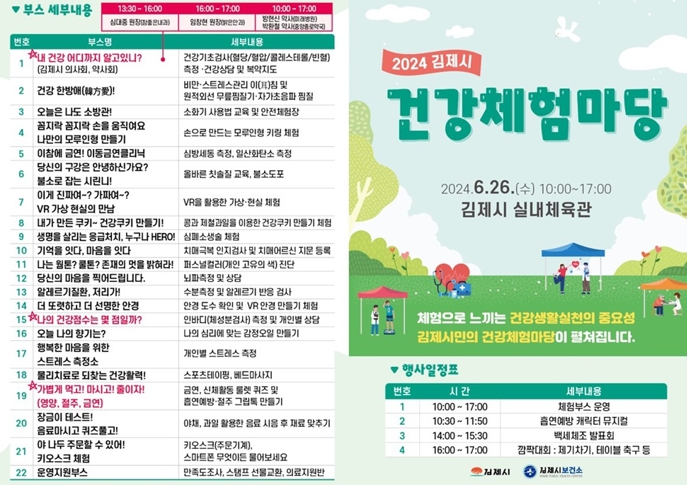 [뉴스서울] 김제시는 오는 26일 10시에서 17시까지 김제시 실내체육관에서 제52회 보건의 날을 기념해 2024 김제시 건강체험마당을 개최한다고 밝혔다.