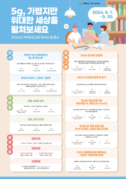 [뉴스서울] 제주시기적의도서관은 9월 독서의 달을 맞아 ‘5g, 가볍지만 위대한 세상을 펼쳐보세요’라는 주제로 어린이와 시민 모두 함께 즐길 수 있는 다채로운 독서 행사를 운영한다.