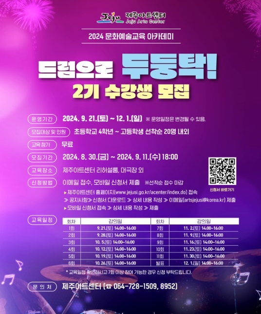 [뉴스서울] 제주아트센터는 2024 문화예술교육 아카데미 '드럼으로 두둥탁!' 2기 수강생을 모집해 운영한다.