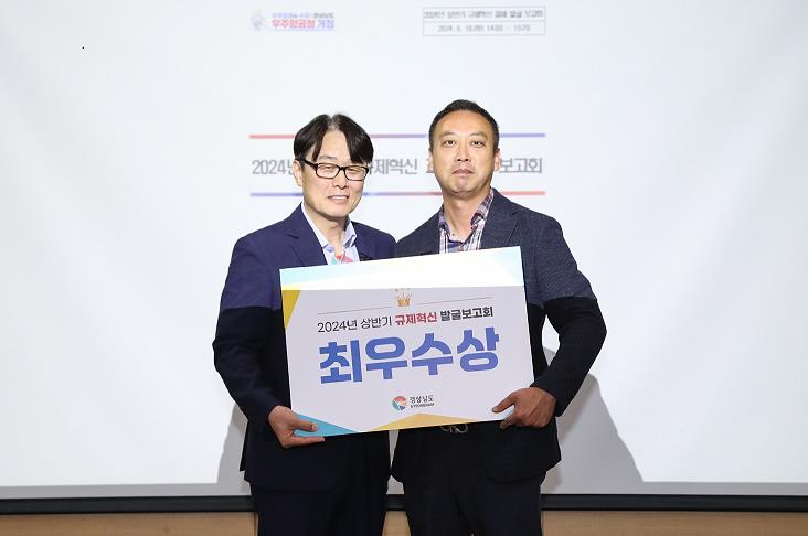 선정된 발표과제에 대해 지난 18일 경상남도청에서 ‘2024년 상반기 규제혁신 보고회’를 열고, 현장 발표 심사를 통해 최우수상 1건, 우수상 2건, 장려상 2건 총 5건을 선정해 시상했다.