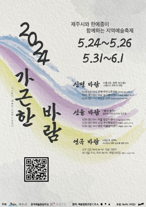 제주시와 한국예술종합학교가 공동으로 주최·주관하고, 예술협동조합 크라가 협업해 국악 한마당, 클래식 기타, 연극 공연 등 3개의 프로그램으로 진행되는 '2024 가근한 바람'은 제주시 읍면동 7개소의 지역 문화공간을 찾아간다.