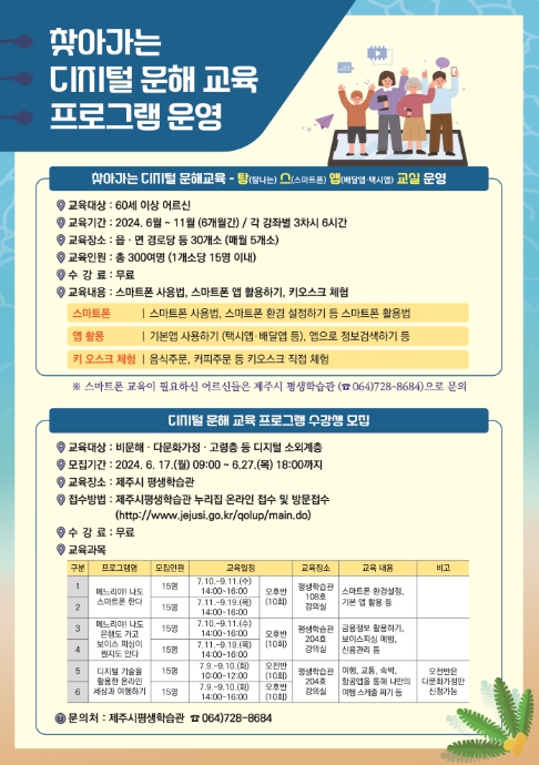 또한 동 지역의 저학력‧비문해 성인 및 다문화 가정을 위해 ▲스마트폰 기초교실(수요반·목요반), ▲보이스피싱 예방 금융 디지털 교육(수요반· 목요반), ▲디지털 기술을 활용한 온라인 활용법 (화요일, 오전·오후반) 등 총 6개 강좌를 제주시 평생학습관에서 진행한다.