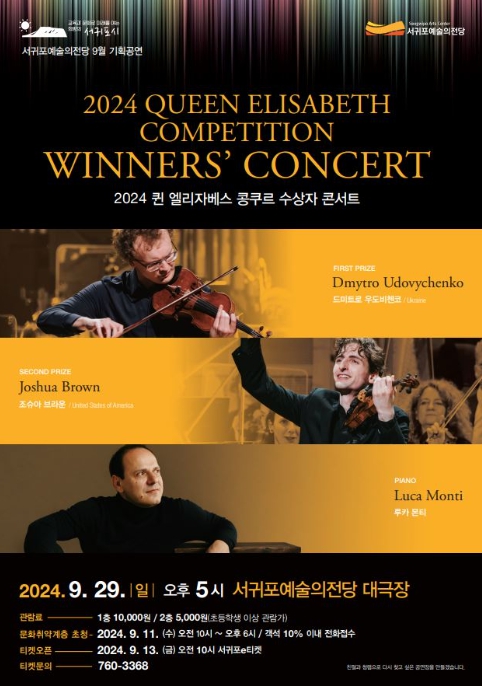[뉴스서울] 서귀포시 서귀포예술의전당은 2024 퀸 엘리자베스 콩쿠르 수상자 초청 공연을 9월 29일 오후 5시 서귀포예술의전당 대극장에서 개최한다고 밝혔다.