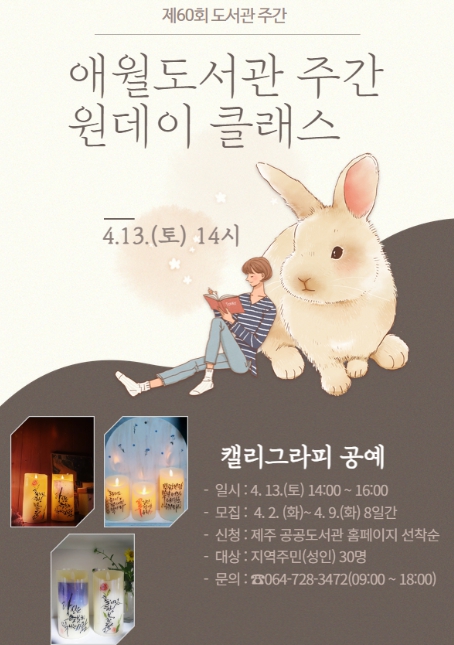 [뉴스서울] 제주시 애월도서관은 도서관의 가치와 필요성을 널리 알리고, 시민들의 활발한 도서관 이용을 도모하기 위한 ‘도서관 주간 원데이 클래스’참여자를 모집한다.
