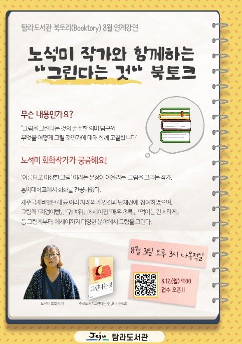 [뉴스서울] 제주시 탐라도서관은 오는 8월 31일 노석미 회화작가와 함께 『그린다는 것』 북토크를 개최한다.