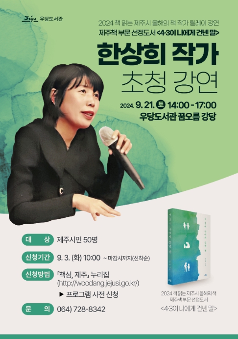 오는 9월 21일 오후 2시 우당도서관 소강당에서 제주시민을 대상으로 진행되는 이번 강연에서 한 작가는 “4·3이 우리에게 건넨 말”이라는 주제로 제주시민들에게 이야기를 들려줄 예정이다.