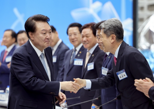 ▲ 지난 20일 이차전지종합관리센터에서 열린 제9차 지방시대위원회에서 포항시는 기회발전특구로 지정됐다 .윤석열 대통령과 인사를 나누고 있는 이강덕 포항시장. |