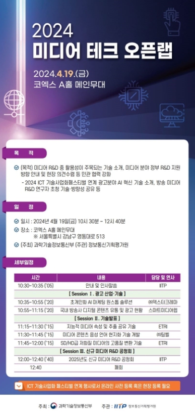“2024년도 ICT 기술사업화 페스티벌”과 연계하여 개최된 이번 행사는 ①광고 분야의 인공지능 혁신 기술 소개, ②방송 미디어 연구 개발 기술 동향 및 연구 성과 공유, ③‘25년 미디어 R&D 신규 사업 관련 공청회 등 총 3개의 세션으로 구성하여 진행됐다.