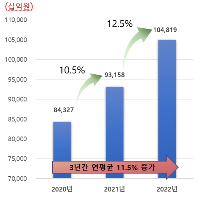 [뉴스서울] 식품의약품안전처와 식품안전정보원은 2023년 국내 식품산업 생산실적이 지난해에 이어 2년 연속으로 100조 원을 돌파한 가운데 전년(104조 8,190억 원) 대비 3.5% 증가(108조 4,875억 원)해 꾸준한 성장세를 보이고 있다고 밝혔다.