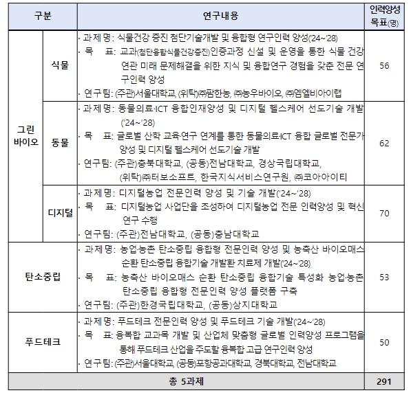 [뉴스서울] 농림축산식품부는 농업 및 농촌에 새로운 부가가치를 창출할 융복합산업의 중요성이 커짐에 따라 스마트농업, 그린바이오, 탄소중립, 푸드테크 분야의 인재양성을 위해 2024년부터 5년간 총 285억 원을 지원하는 “농식품 과학기술 융합형 연구인력 양성 연구개발(R&D) 사업” 대상자를 선발했다.