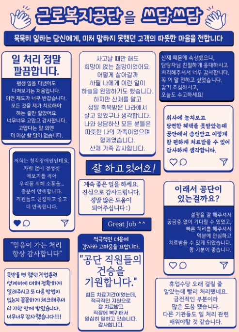 또 수집된 의견 중 약 28.3%는 업무를 처리한 공단 직원에게 전하는 고객의 감사인사로 나타났다. 한 고객은 “저희는 청각장애인인데, 정성껏 메모지를 적어 소통을 해주셨습니다.”라며 감동을 표현했으며, 한국어가 서툰 외국인 고객도 자국어로 진심 어린 감사인사를 남겨 눈길을 끌었다. 공단은 마음이 따뜻해지는 고객의 칭찬 글을 모아 공단이 보유한 온‧오프라인 매체를 통해 공유하는 “쓰담쓰담 캠페인”을 펼쳐 직원의 자긍심을 높이고 고객 중심 조직문화를 확산할 예정이다.