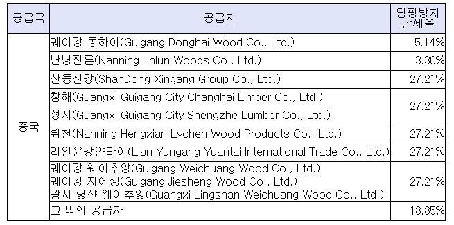 | ▲ 공급자별 덤핑방지관세 부과율(중국산 합판 반덤핑조사(3차재심) ) |