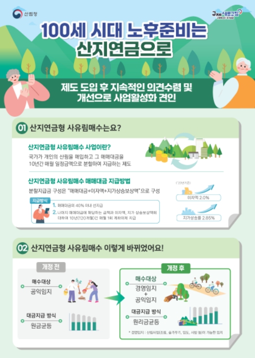 산림청은 지난 2021년 제도 도입 이후 매년 산주들의 의견을 수렴해 매매가능한 최소 면적기준을 없애고 계약 시 매매대금을 최대 40%까지 선지급하는 등 적극행정을 통해 산지연금형 사유림 매수제도를 활성화해 왔다.