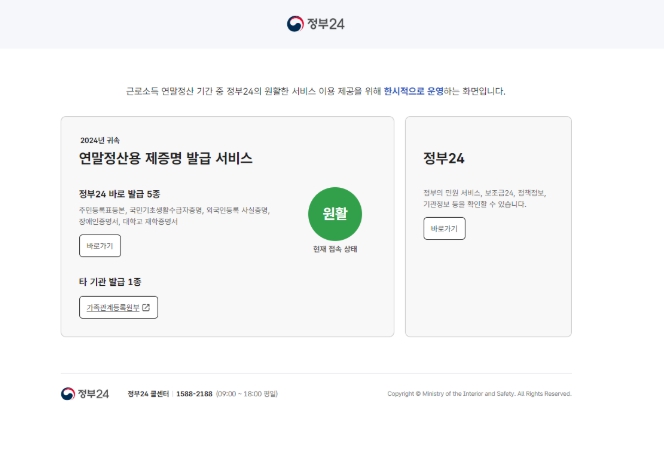 행정안전부는 연말정산 기간에 이용자 접속이 급증할 것에 대비해 전용창구를 운영하고, 서비스 분산을 위해 순번 대기 표시기능을 적용하는 등 불편을 최소화하여 정부24 운영의 안정성을 높인다는 계획이다.