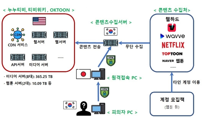 ‘누누티비’ 운영자는 범죄 수익원이 되는 불법 도박사이트 운영조직과도 긴밀한 관계를 맺어 해외에 서버를 구축하고, 품질을 높이기 위한 트래픽 실시간 모니터링, 콘텐츠 전송 네트워크(CDN) 등 기법을 도입해 불법으로 제공하는 콘텐츠의 안정성도 유지하는 치밀함을 보였다. 또한 수사기관의 추적을 따돌리기 위해 해당 서버에 접속 시 다중 가상 사설망(VPN)과 해외 신용카드, 해외 가상자산 거래소를 이용했다. ‘오케이툰’을 운영하기 위해서는 국내 정식 웹툰 플랫폼의 작품을 무단으로 복제해 게시하는 과정에서 불특정 다수로부터 정식 웹툰 사이트 계정을 수집하는 등 치밀한 범행 수법을 보였다.