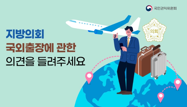 [뉴스서울] 국민권익위원회는 지방의회 의원의 국외출장 개선방향에 관하여 설문조사 방식으로 국민 의견을 수렴한다.