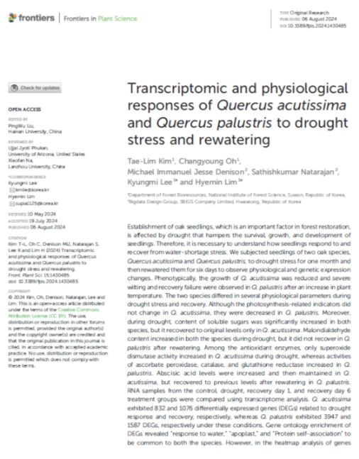 연구진은 건조지역에 분포하는 상수리나무와 습한 지역에 분포하는 대왕참나무를 대상으로 RNA 전사체와 생리활성물질 분석을 통해 참나무류의 건조 저항성 기작 구명 연구를 수행했다.