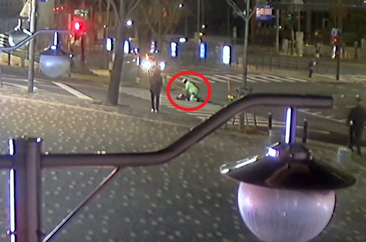 ▲ 오재현 환경공무관이 심폐소생술을 실시하는 모습 (붉은 원, CCTV 화면 캡처) |