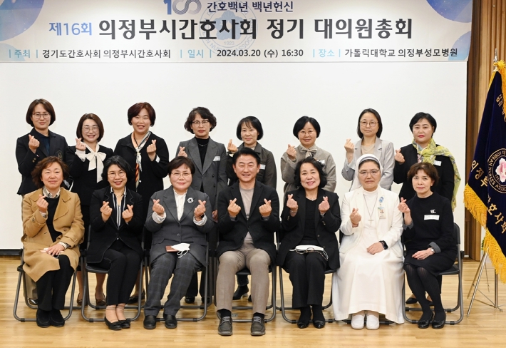 | ▲ 김동근 시장이 3월 20일 가톨릭대학교 의정부성모병원에서 열린 의정부시간호사회 정기총회에서 참석자들과 기념사진을 찍고 있다. |