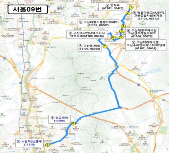 서울09번은 민락교, 정음마을고산2단지.고산종합사회복지관, 고산대방노블랜드아파트, 고산대광로제비앙.센트레빌아파트, 고산더라피니엘.고산수자인디에스티지1단지, 고산수자인디에스티지.아트포레, 고산동.빼벌, 당고개역, 노원역9번 출구까지 9개 정류소를 운행한다.