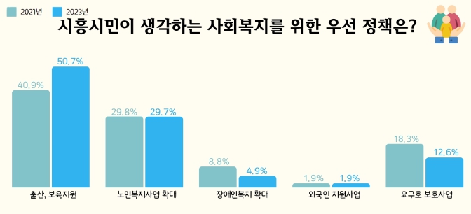 특히 출산, 보육 지원 정책에 관한 관심은 2021년에 비해 약 10% 증가했다. 이러한 인식을 반영해 시흥시는 민선 8기 공약사항인 ‘산후조리 공공서비스 지원’ 강화 방안으로 2024년부터는 산후 조리비 및 출생 축하금을 신규 지원하는 등 출산 지원 정책을 확대 추진하고 있다.
