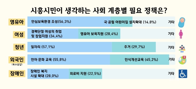 사회 계층별 필요 정책을 살펴보면 영유아는 ‘안심하고 맡길 수 있는 보육 환경 조성 (56.3%)’, 여성은 ‘경력 단절 여성의 취업 및 창업 지원(34.4%)’, 청년은 ‘일자리(일자리 확대 및 창업 지원 등)(57.1%)’, 외국인 주민(다문화 가정 포함)은 ‘언어ㆍ문화 교육(55.8%)’, 장애인은 ‘장애인 복지시설 확대(직업훈련장, 문화/체육시설 등)(28.0%)’을 가장 중요한 정책으로 뽑았다.