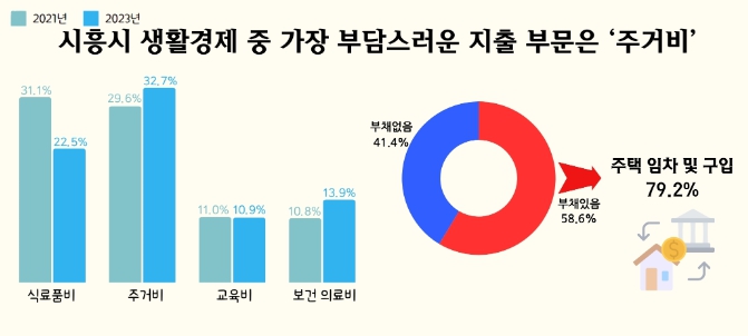 생활비 중에서 가장 부담스러운 지출 부문을 조사한 결과, ‘주거비’가 32.7%로 가장 높은 비중을 차지했고, 그다음으로는 ‘식료품비’ 22.5%로 나타났다. 이를 증명하듯 현재 가구에 부채가 있다는 응답 58.6% 중 부채의 원인으로는 ‘주택 임차 및 구입’이 79.2%로 가장 큰 비중을 차지하는 것으로 나타났다.