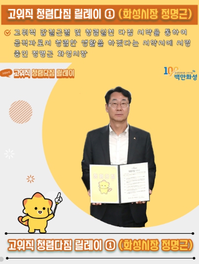 [뉴스서울] 화성시가 지난 9일 화성시장을 포함한 17명의 고위공직자가 참여한 갑질근절 및 청렴다짐 선언식을 가진 이후 화성시장을 필두로 개인 SNS를 통한 청렴다짐 릴레이를 시작했다.