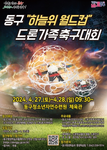 대전 동구는 오는 4월 27일부터 28일까지 2일간 동구 청소년 자연수련원에서 미래형 레저스포츠 저변 확대를 위한 ‘동구 드론가족축구대회’를 개최한다고 2일 밝혔다.