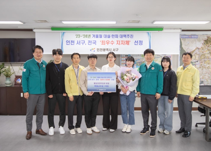 [뉴스서울] 인천 서구는 2023~2024년 겨울철 자연재난(대설‧한파) 대책추진 평가에서 전국 226개 기초자치단체중 1위인 ‘최우수’ 지자체로 선정되어 행정안전부 기관표창과 함께 특별교부세 1억원을 지원받는다.